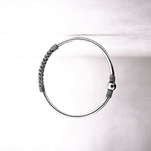 Elevate your ethnic style with this handcrafted 925 silver oxidized kada, designed with a minimal yet bold tribal touch. The sleek silver band is adorned with intricate detailing near the clasp, creating a perfect blend of traditional artistry and contemporary wearability. This unisex bangle is versatile enough to complement both men’s and women’s ethnic or fusion outfits.