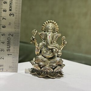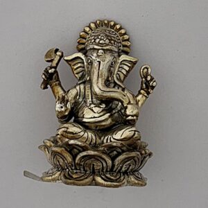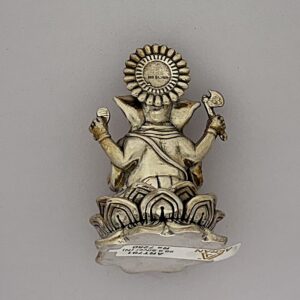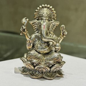 Design: Lord Ganesha seated on a lotus with traditional ornaments and symbolic items