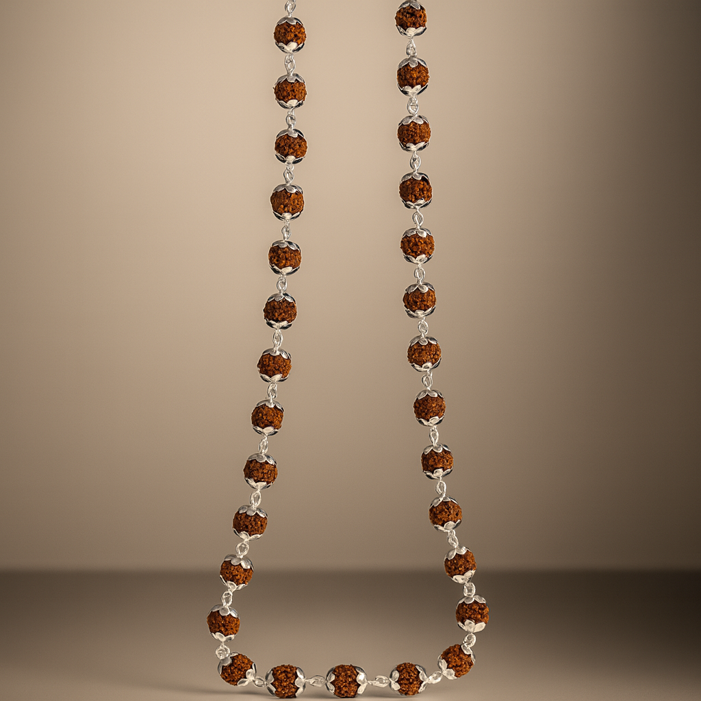 Sterling silver solid handmade natural rudraksh beads chain necklace .54+1 bead or rudraksh is use in this necklace, it use as japp mala, we pray to god 108 time for any wish.so this is half japp mala 23 inches long necklace. unisex jewelry form rajashthan india. Rudraksha is belong to god shiva.